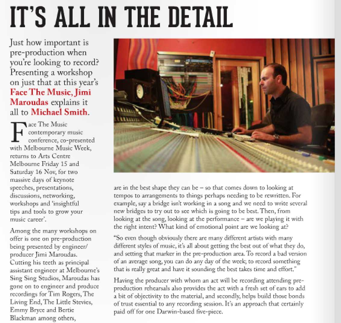 Jimi Maroudas started his career working as principal assistant engineer at world-renowned Sing Sing Studios in Melbourne where he worked with and learnt from some of Australia’s and the world’s top producers including Charles Fisher (Radio Birdman, Savage Garden, Olivia Newton-John), David Nicholas (INXS, Elton John), Grammy Award Winners David Bianco (Mick Jagger, Teenage Fanclub, Tom Petty), Adam Kaspar (Pearl Jam, REM, Foo Fighters, Queens of the Stone Age, Nirvana), and Mark Wallis (U2, The Smiths).